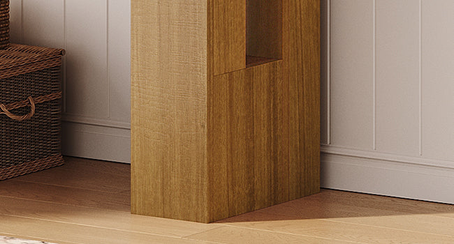 A3: Crafted from high-quality panels with a natural wood finish, this wood console table combines durability with elegance. The rectangular grooves on the legs add a stylish design detail, making it suitable for a farmhouse console table or modern console table decor.
