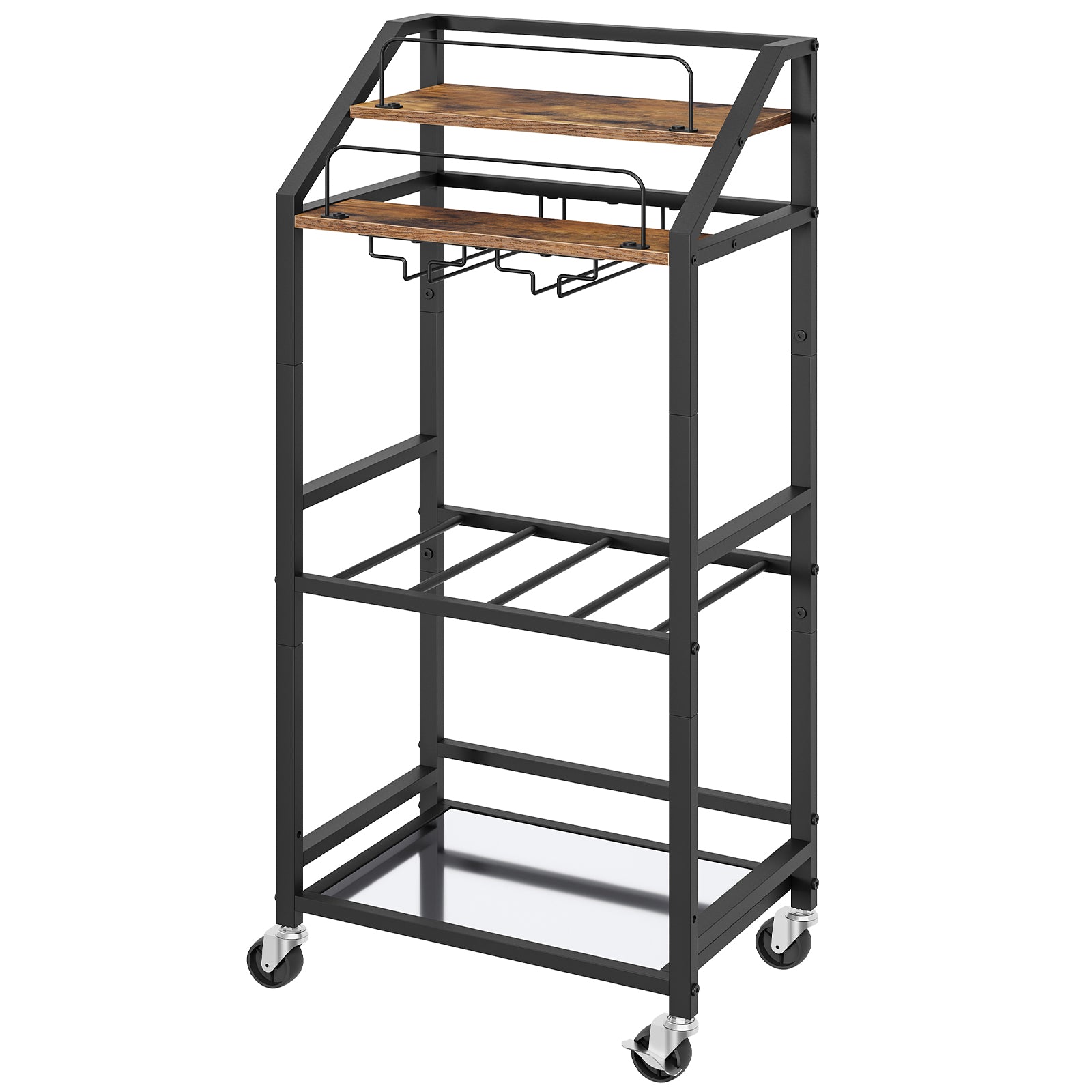 Elevate your entertaining experience with this 4-Tier Rolling Bar Cart. This versatile serving cart combines elegant design with practical functionality, featuring a spacious 3-tier layout that accommodates 4 wine bottles and 6 glasses. With smooth-rolling casters and protective guardrails, it's perfect for everything from kitchen organization to outdoor parties.
