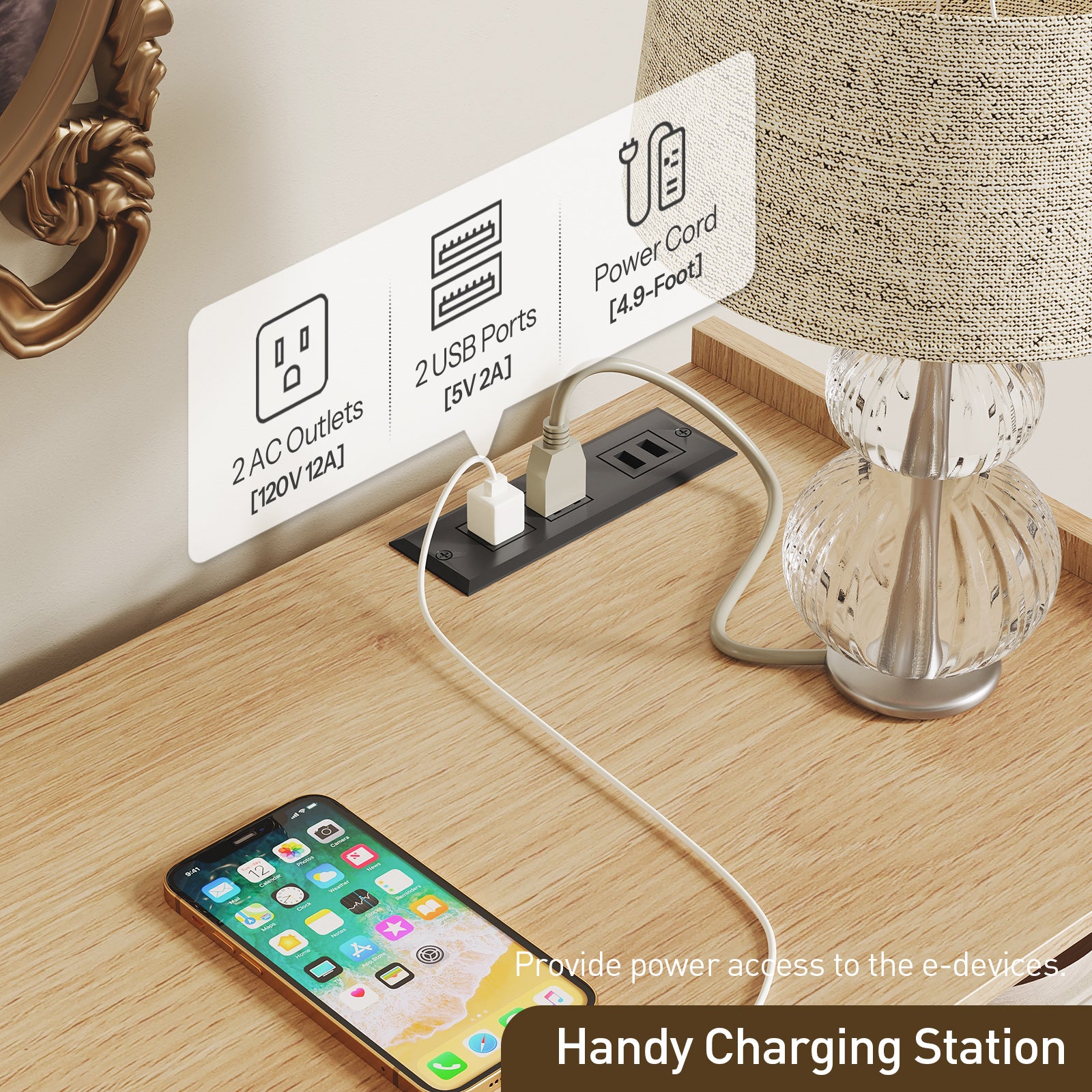 Stay connected and charged with the built-in power strip featuring 2 standard sockets and 2 USB ports. This innovative design eliminates the need for unsightly extension cords or searching for available outlets. Conveniently charge your phone, tablet, smartwatch, and other electronic devices right where you need them. The power station is seamlessly integrated into the design, maintaining the dresser’s sleek appearance while adding modern functionality.