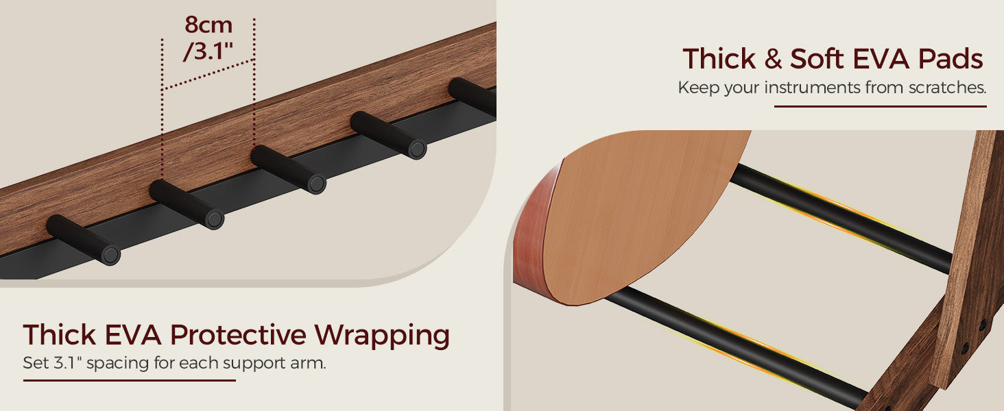 Gentle Protection: Your guitars deserve the best care, and this wooden guitar stand ensures just that. The thick EVA-wrapped arms are soft to the touch and effectively protect your instruments from scratches. The wide spacing and robust bottom offer stability, keeping your guitars safe from accidental bumps and knocks.