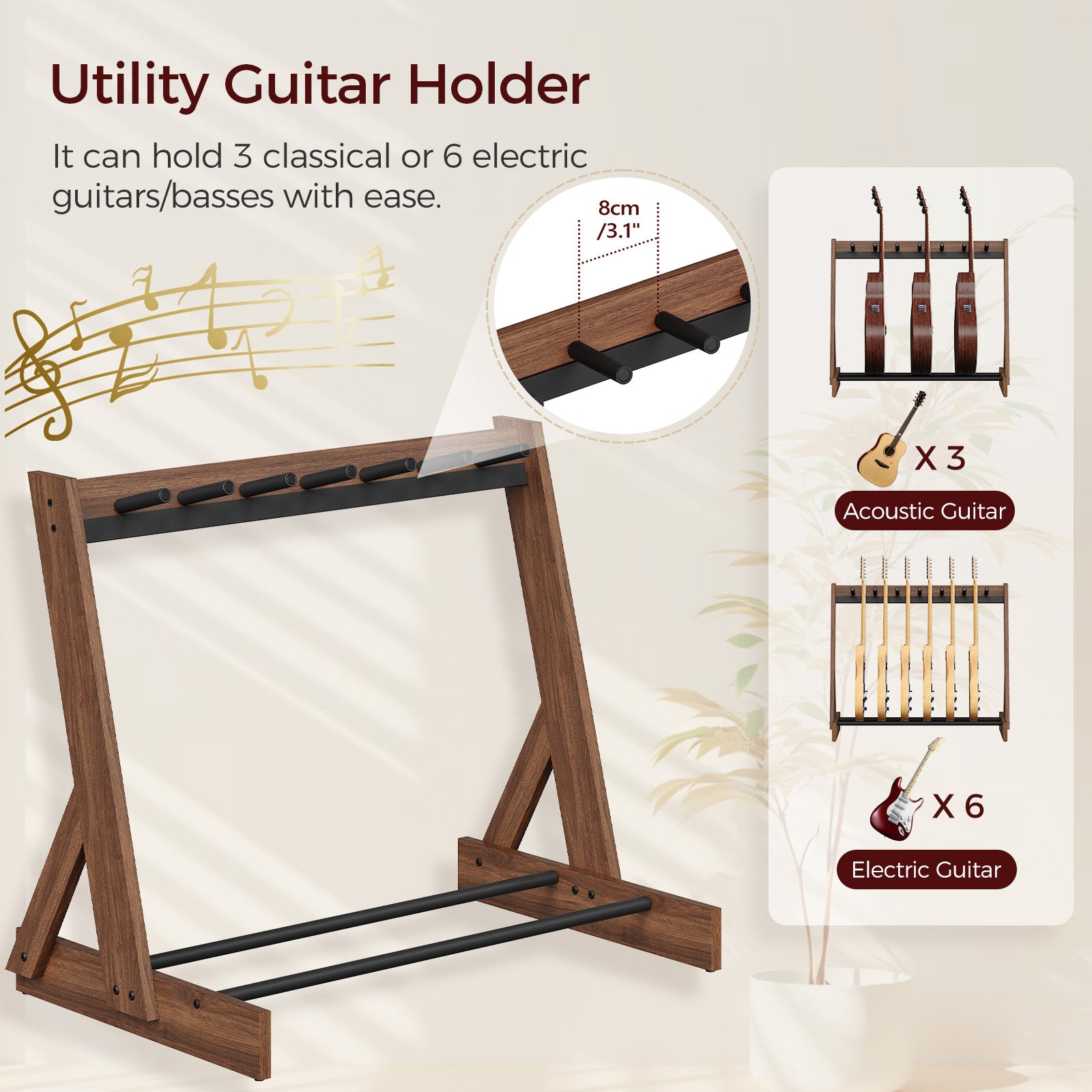 This multi-guitar stand can easily hold up to 4 classical guitars or 6 electric guitars and basses. With its sturdy construction, it's perfect for displaying or storing a variety of instruments, including bass guitars and acoustic guitars.